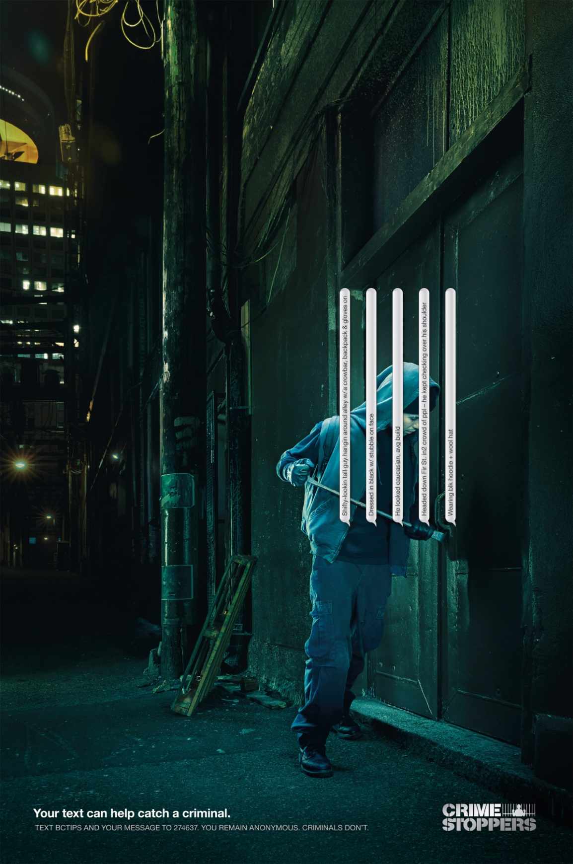 Text inside image: You text can help catch a criminal. Text bctips and your message to 274637. You remain anonymous. Criminals don't.