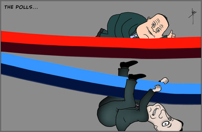 Text outside image: Election Campaign 2013. The polls keep showing a good margin for Labour but the eventual landslide (54% of the popular vote) leaves many surprised.