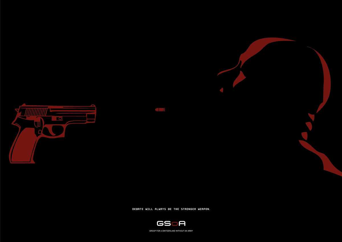 Text inside image: Debate will always be the stronger weapon. Group for a Switzerland without an army.