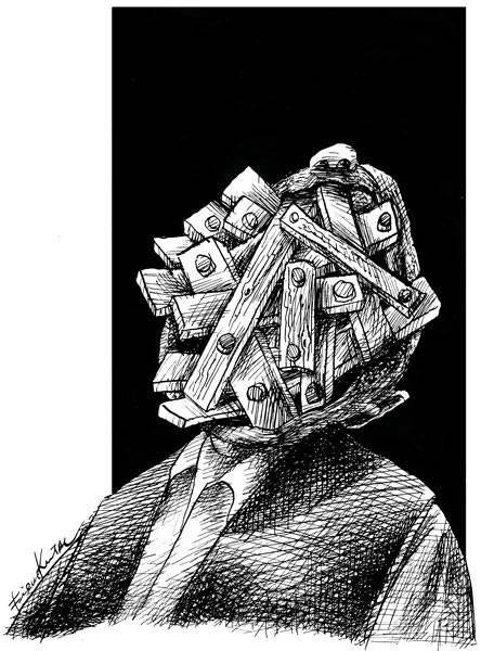 Notes: Mouth shut with wood bars. Talking ability is impaired. Not being able to expressing oneself is having the mouth physically blocked.